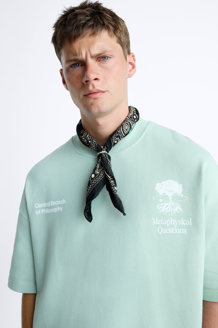 Loose-fitting sweatshirt with a round neck and short sleeves. Featuring a contrast slogan print all over the garment.